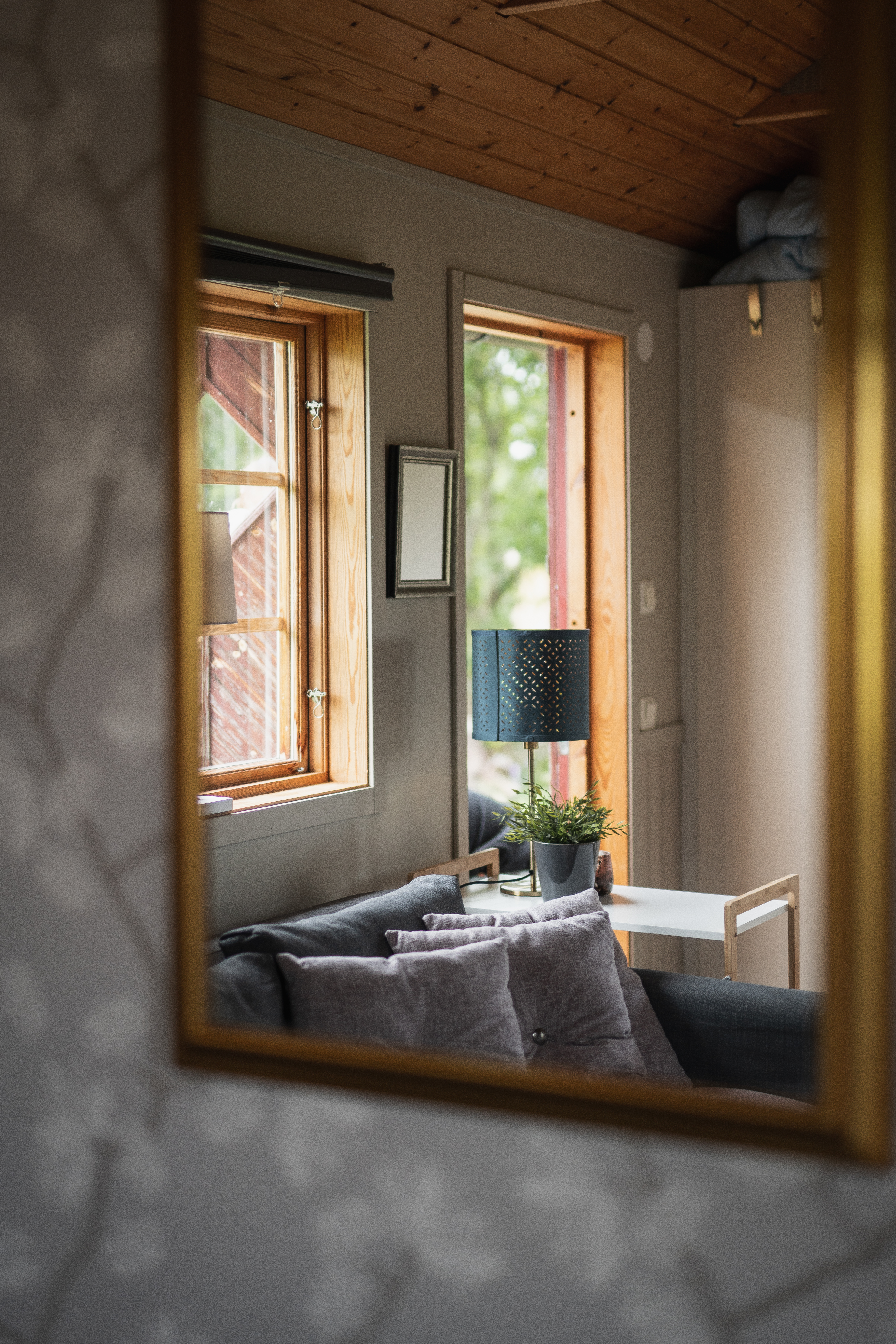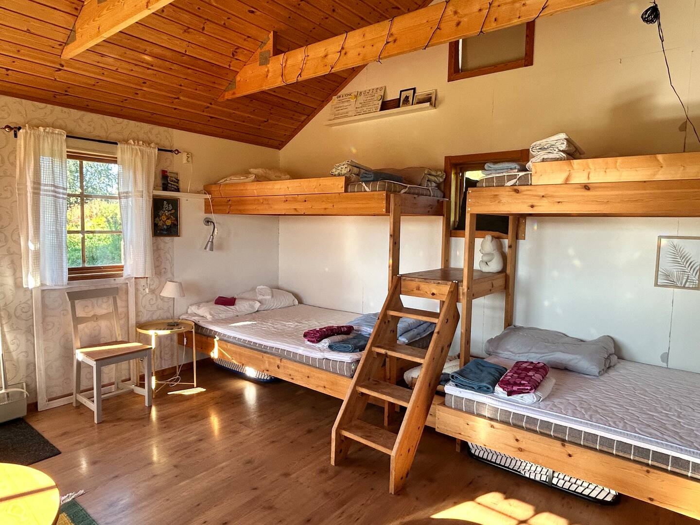 Gästerna får en speciell upplevelse eftersom detta fyrbäddsrum har en fantastisk utsikt över sjön Alstern. Stugan har två våningssängar: de nedre bäddarna är 1,20 m breda och de övre cirka 90 cm. I det fullt utrustade pentryt finns spishäll, kylskåp, mikrovågsugn samt vattenkokare och kaffebryggare. Fyrbäddsrummet har dessutom egen ingång och en terrass med sjöutsikt samt tillgång till ett en delad wc-stuga med dusch, toaletter och tvättmaskin. Rummet har 4 bäddar och stugan har också en grill. Gratis Wifi ingår. Bastu finns i separat byggnad och går att hyra från 300 kr.