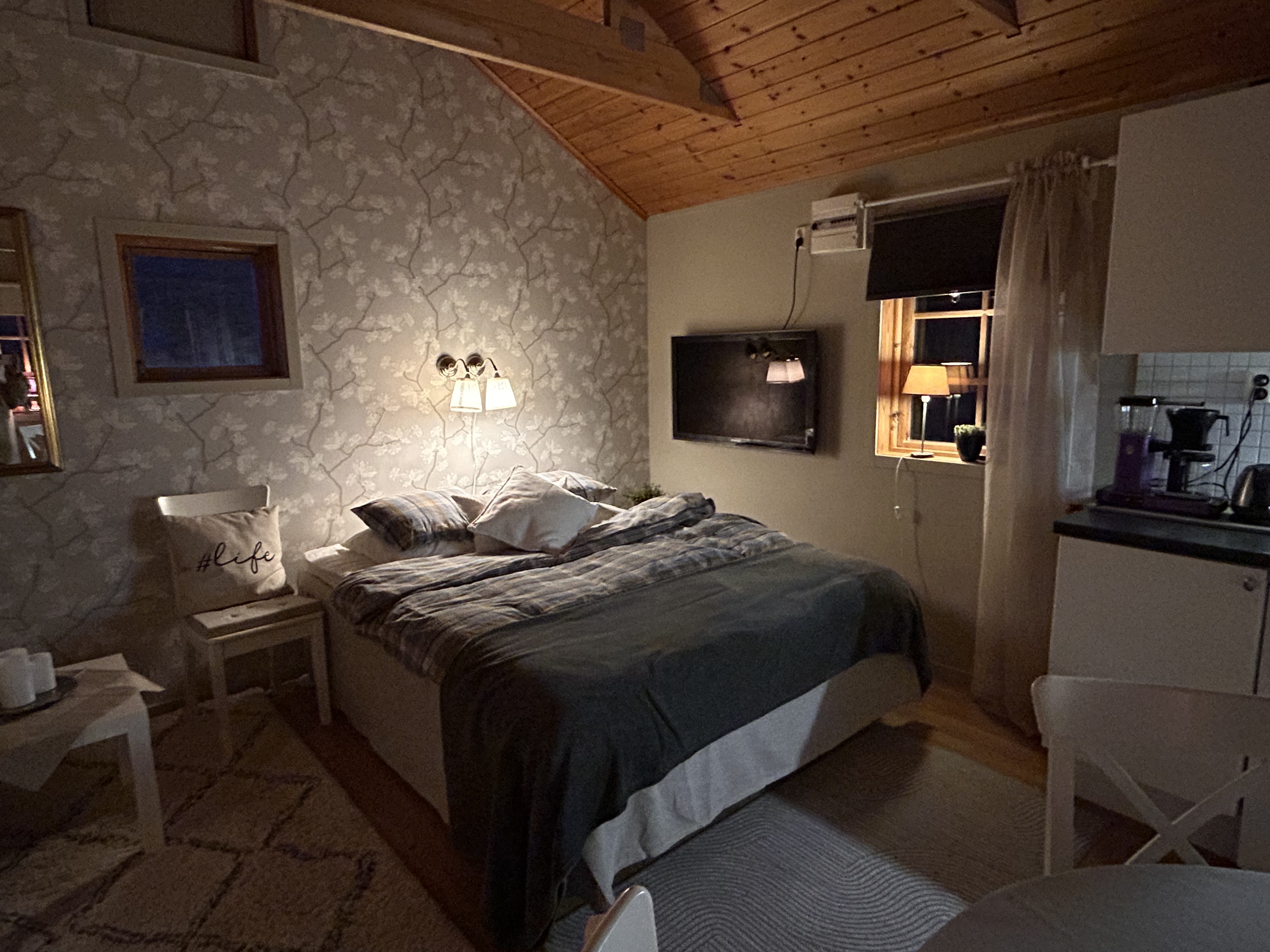 Gästerna får en speciell upplevelse eftersom detta fyrbäddsrum har en fantastisk utsikt över sjön Alstern. Detta familjerum har en dubbelsäng samt en bäddsoffa bekväm nog för två vuxna personer. I pentryt finns spishäll, kylskåp, mikrovågsugn samt vattenkokare och kaffebryggare. Fyrbäddsrummet har dessutom egen ingång och en terrass med sjöutsikt samt tillgång till en delad wc-stuga med dusch, toaletter och tvättmaskin. Rummet har 4 bäddar och stugan har också en grill. Gratis Wifi ingår. Bastu finns i separat byggnad och går att hyra från 300 kr.